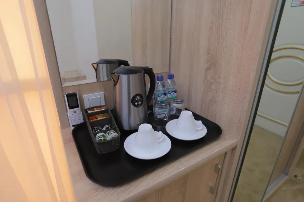 В каждом номере есть чайный набор (чай, кофе, сахар, чайник) и вода в бутылках.